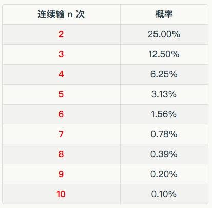每次输赢的概率都是 50%,而连续 2 次都输的概率是 25%(0.5×0.5),连续 3 次都输的概率是 12.5%……
